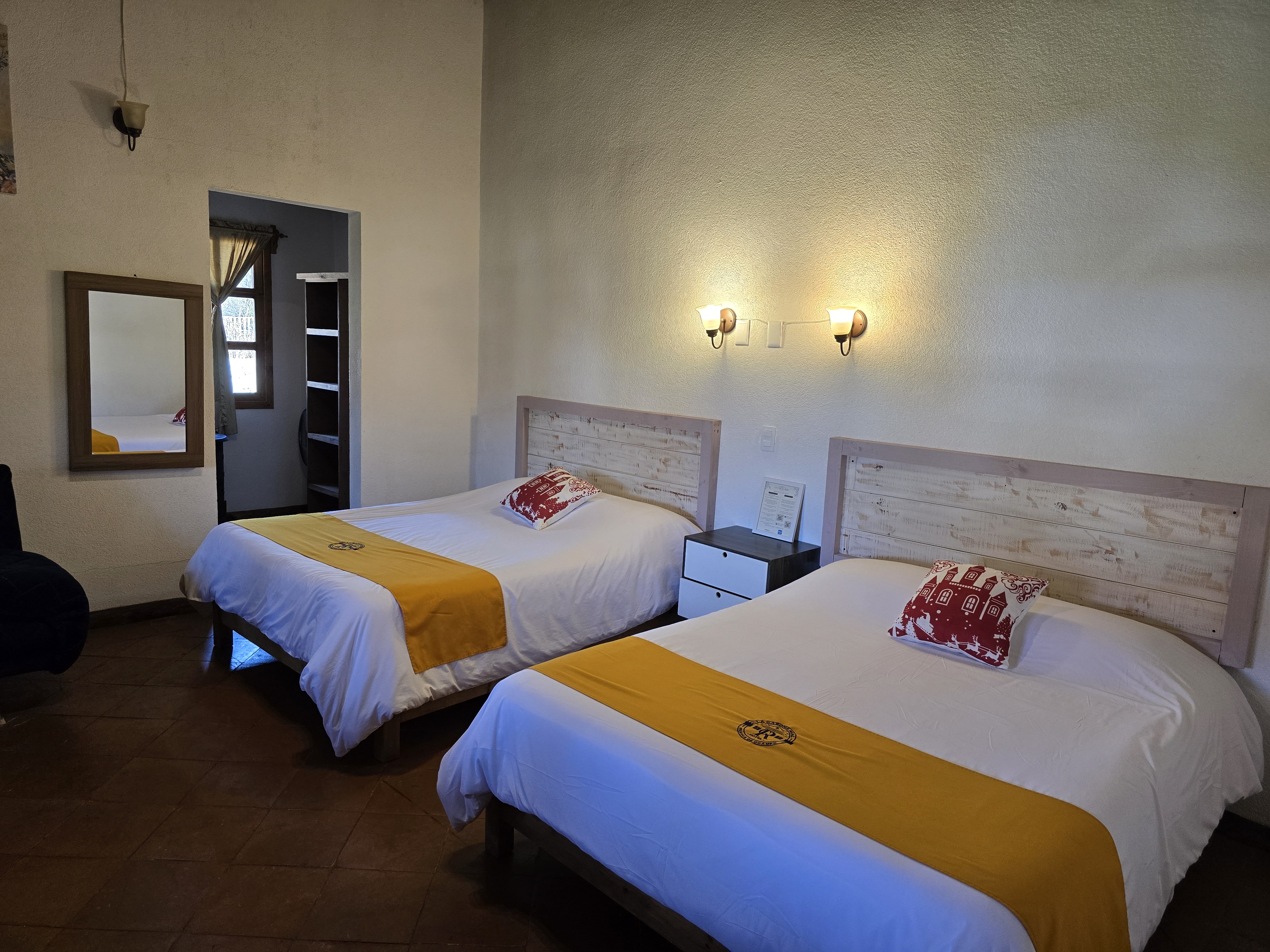 Cuatro habitaciones que cuentan con dos camas queen, calenton, pantallas de 50 pulgadas, servicio de streaming, sala, terraza privada, servicio de cafetera y snaks.